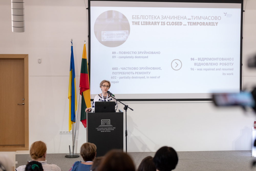 Apie karo metu išryškėjusį Ukrainos bibliotekų vaidmenį stiprinant demokratinę visuomenę kalbėjo Ukrainos bibliotekų asociacijos vicepirmininkė Larysa Luhova. „Mūsų veiksmai pasireiškia praktiniais sprendimais ir prisitaikymu prie aplinkos. Bibliotekos imasi iniciatyvų kurti prieglaudas savo patalpose šeimoms per Rusijos bombardavimo reidus, riša kamufliažinius tinklus kariuomenei, kovoja su dezinformacija, pagalbai ir paramai telkia tarptautinę bendruomenę. Po 2022 m. vasario 24 d. prasidėjo nauja realybė. Šiandien tiksliai negalime pasakyti, kiek bibliotekų dirba Ukrainoje. Bet galime pasakyti, kad rusų fašistai 89 bibliotekas visiškai sunaikino, 602 – yra iš dalies sugriautos, jas būtina prikelti iš griuvėsių. Okupuotose teritorijose rusai naikina bibliotekų fondus ukrainiečių kalba, ypač knygas apie Ukrainos istoriją, kultūrą, švietimą. Jie bando sunaikinti mūsų atmintį, mūsų kalbą, bet jiems nepavyks. Iš įvairių aukštų tribūnų visame pasaulyje mes kalbame tiesą apie karą, renkame dokumentus, įrodančius Rusijos nusikaltimus kultūrai ir bibliotekoms“, – sakė L. Luhova.