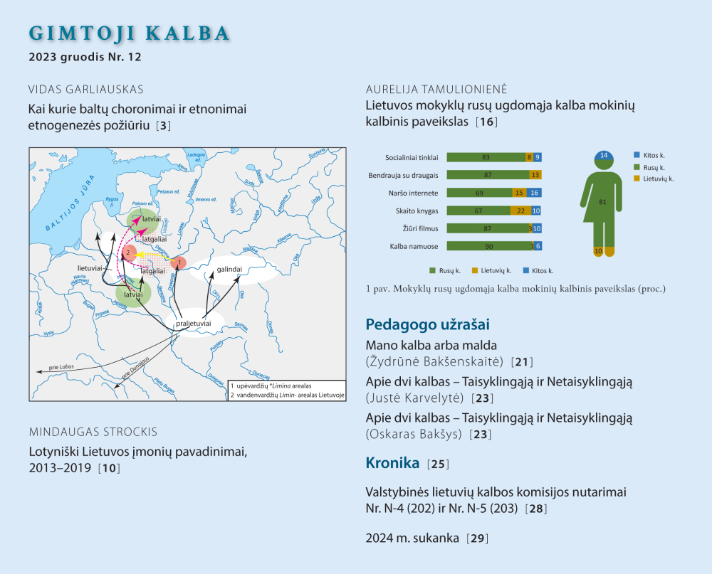 „Gimtosios kalbos“ gruodžio mėnesio numeryje etnogenezės aspektu žvelgiama į svarbiausių baltų kraštovardžių (Latvija, Lietuva, Prūsija) ir tautovardžių (latvis, lietuvis, prūsas) kilmę, pateikiama patarimų įmonių steigėjams, norintiems pasirinkti lotynišką pavadinimą, skelbiamas dar vienas straipsnis apie Lietuvos mokinių, kuriems lietuvių kalba nėra gimtoji, kalbinio paveikslo tyrimus.