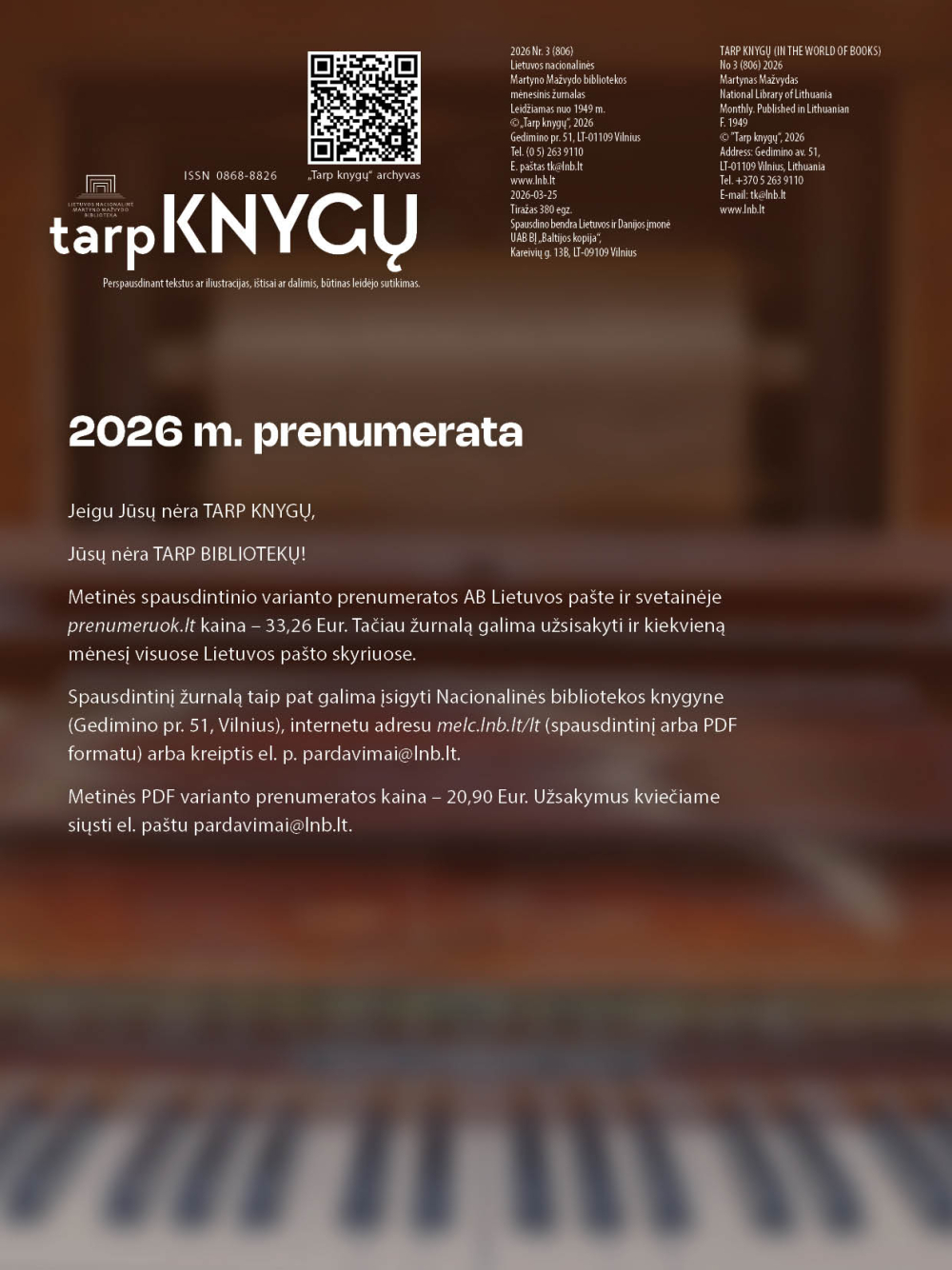 Primename, kad žurnalą galima užsisakyti visuose AB Lietuvos pašto skyriuose. Lietuvos nacionalinėje Martyno Mažvydo bibliotekoje galite užsisakyti ir metinę PDF varianto prenumeratą.