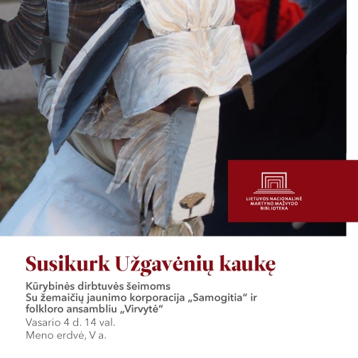 Žemaičių Užgavėnių folklore dainuojama: „Išeis Lašinskis, pareis Kanapinskis, bliaus tievs, bliaus muotėn, bliaus ėr vėsė vākā...“ Kad netektų bliauti, pagal paprotį žiemą išvaryti reikėtų linksmai, triukšmingai, su pokštais, dainomis ir, žinoma, spalvingiausių persirengėlių vaikštynėmis. Anksčiau kiekvienas šventės dalyvis stengėsi persirengti ir nors pusdienį pabūti kitu – keistu, juokingu žmogumi ar net gyvūnu. O šiandien ar mokame, ar žinome, kaip pasiruošti Užgavėnėms, kaip susikurti savo personažą? Tai – ne tik kaukės meistravimas ir jos dėvėjimas šventėje, tai ir veiksmas, kupinas išradingos, įmantrios kalbos, sumaniai pritaikyto folkloro ir smagaus pasidūkimo. Todėl kviečiame į kūrybines dirbtuves, skirtas visai šeimai, – „Susikurk Užgavėnių personažą“. Darysimės kaukes, aiškinsimės, kokia jų paskirtis, ką vienas ar kitas personažas turėtų ir galėtų veikti, koks folkloras tinka persirengėliams. Būtent tai, ko reikia norint tinkamai pasirengti Užgavėnėms. Renginio partneris folkloro ansamblis „Virvytė“ dalyvauti kviečia šeimas, ypač vaikus, jaunimą, ir visus susidomėjusius, – tuos, kurie mėgsta ir nori būti šventės šurmulio dalyviai.
