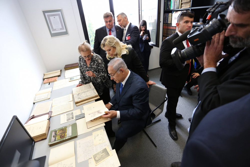 Rugpjūčio 24 d. Lietuvos nacionalinėje Martyno Mažvydo bibliotekoje įvykus istoriniam Izraelio ir Baltijos šalių premjerų forumui, Izraelio premjeras Benjaminas Netanyahu sekmadienį, rugpjūčio 26 d., sugrįžo į biblioteką dar vienam, emocionalesniam susitikimui – pažinčiai su Nacionalinėje bibliotekoje įkurtu Dokumentinio paveldo tyrimų departamento (DPTD) Judaikos tyrimų centru ir jame saugoma unikalia žydų knygų ir rankraščių kolekcija. Šis oficialioje valstybinio vizito programoje nenumatytas apsilankymas buvo organizuotas asmeniniu Izraelio premjero, save išdidžiai vadinančio litvaku ir nepaprastai besidominčio Lietuvos ir Vilniaus žydų bendruomenės praeitimi ir dabartimi, pageidavimu. Benjaminą Netanyahu ir jo žmoną Sarą į Judaikos tyrimų centrą lydėjo Izraelio ambasadorius Lietuvoje Amiras Maimonas, Lietuvos ambasadorius Izraelyje Edminas Bagdonas, Lietuvos užsienio reikalų ministras Linas Linkevičius, Lietuvos žydų bendruomenės pirmininkė Faina Kuklianski, Izraelio ir Lietuvos žurnalistai.
