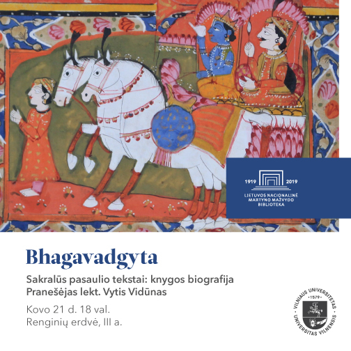 Tai vienas garsiausių ir įtakingiausių Indijos religinę ir filosofinę mintį reprezentuojančių tekstų, dažnai perkeltine prasme pavadinamas hinduizmo Biblija. Paskaitoje bus glaustai pristatyta poemos struktūra ir turinys, svarbiausios sąvokos ir idėjos. Pagrindinis dėmesys, kaip ir kitose šio ciklo paskaitose, bus skiriamas teksto „biografijai“. Dar ir šiandien mokslinėje literatūroje diskutuojama dėl „Bhagavadgytos“ sukūrimo laiko ir jos santykio su pagrindiniu senovės Indijos epo „Mahabharatos“ tekstu. Paskaitoje bus pristatytos su teksto geneze susijusios problemos ir įvairių tyrinėtojų pasiūlyti sprendimo būdai. Apžvelgsime „Bhagavadgytos“ vietą ir funkcijas įvairiais Indijos istorinės ir kultūrinės raidos etapais, jos reikšmę šiandienos socialiniame ir politiniame kontekste. Jau daugiau nei du šimtmečius „Bhagavadgyta“ yra vienas dažniausiai verčiamų ir komentuojamų indiškosios tradicijos tekstų Vakaruose – aptarsime pagrindinius teksto vertimus ir galimas įtakas. Lietuvoje „Bhagavadgytos“ vertimų tradiciją pradėjo V. Vydūnas, kuriam ir priklauso pirmasis poemos vertimas į lietuvių kalbą. Paskaitoje dar apžvelgsime ir palyginsime įvairiais laikotarpiais ir aplinkybėmis pasirodžiusius lietuviškuosius „Bhagavadgytos“ vertimus.