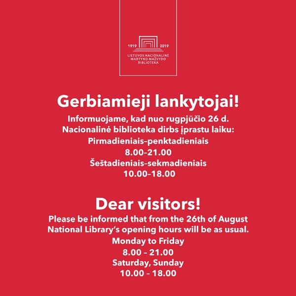 Mielieji lankytojai, informuojame, kad nuo rugpjūčio 26 d. Nacionalinė biblioteka dirbs įprastu laiku.