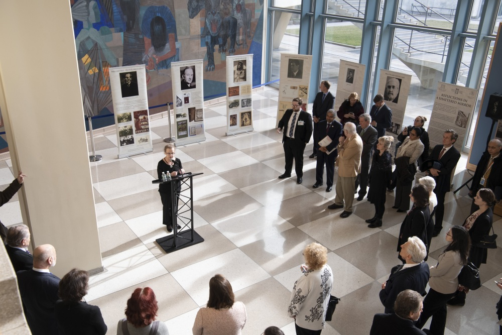 Paroda „Atspindžiai suskilusiame veidrodyje“ pristato Lietuvos nacionalinėje Martyno Mažvydo bibliotekoje saugomą judaikos spausdintinį ir rankraštinį palikimą. Atidaryme parodos kuratorė Nacionalinės bibliotekos Judaikos skyriaus vadovė dr. Lara Lempertienė išsamiai pasakojo apie parodą ir jos eksponatus. „Parodos ekspozicija siekiama parodyti turtingą ir įvairiaspalvį visos Lietuvos ir atskirai Vilniaus žydų bendruomenių gyvenimą tarpukariu – socialinės rūpybos ir medicinos sistemą, švietimo ir ugdymo institucijas, meną, mokslą ir literatūrą, svarbią šių bendruomenių vietą tarptautiniame žydų kultūros kontekste“, – sakė parodos kuratorė.