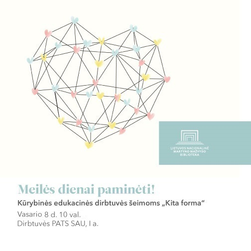 Kviečiame dalyvauti pirmosiose šiais metais kūrybinėse dirbtuvėse „Kita forma“ Lietuvos nacionalinėje Martyno Mažvydo bibliotekoje. Šį kartą ruošimės Meilės dienai: mylimam žmogui gaminsime mielų smulkmenų, dovanėlių iš antrinių žaliavų. Pradžiuginsime mamą, tėtį, kaimyną ar geriausią draugą, nepamiršdami meilės supančiai aplinkai ir gamtai. Juk taip gera švęsti meilę ir ja dalintis!