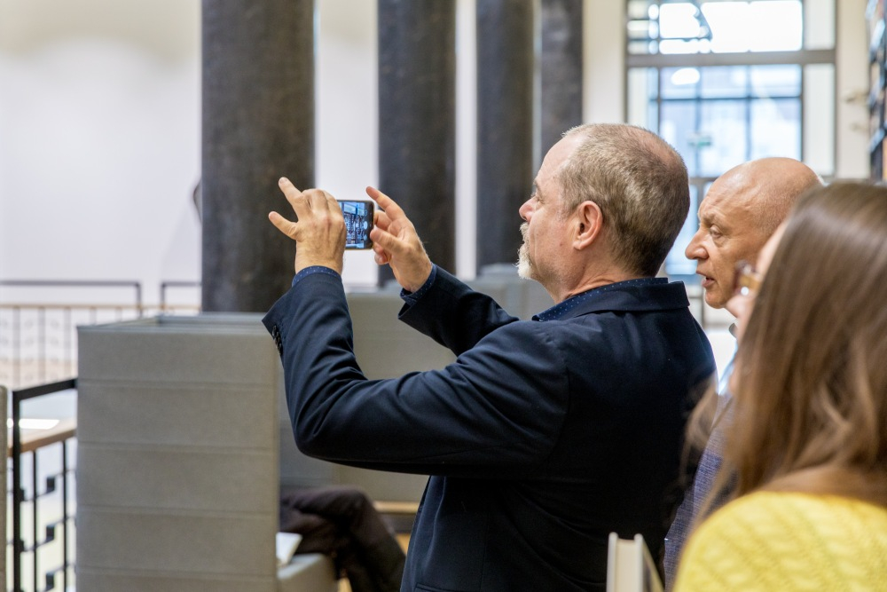 Nacionalinės bibliotekos vadovas prof. dr. R. Gudauskas svečiui trumpai pristatė bibliotekos veiklą, pasiekimus, iniciatyvas ir ateities strategijas, jos virsmą modernia gyvąja biblioteka. Prof. J. A. Samitas akcentavo viešojo sektoriaus gebėjimą žengti koja kojon su naujausiomis technologijomis ir net būti žingsniu priekyje. „Svarbu panaudojant naujausias technologijas „eiti į žmones“. Reikia būti tarp žmonių, kartu ypatingą dėmesį skiriant dar visiškai eksperimentinėms, futuristinėms technologijoms ir inovacijoms“, – sakė svečias. J. A. Samitas kalbėjo ir apie duomenų atvėrimo svarbą gerinant žmonių gyvenimo kokybę, taip pat mokslui ir verslui. Akcentavo, kad duomenų atvėrimas gali tapti galingu pažangos varikliu. Jo manymu, mes turime pranašumą, nes esame maža šalis, o mažose šalyse pokyčiai gali būti įgyvendinami žymiai greičiau nei didelėse, tokiose kaip Vokietija ar JAV. Ir turėdami valstybės palaikymą mes galime būti proveržio priešakyje.