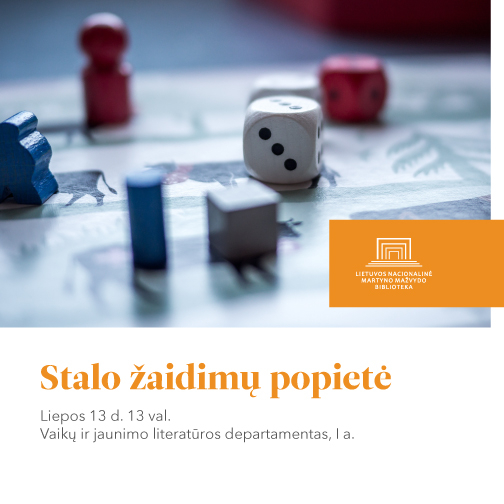 | Liepos 13 d. | 13 val. | 1 val. | Vaikų ir jaunimo literatūros departamentas, I a. | Stalo žaidimų popietė (7–12 m. vaikams) |